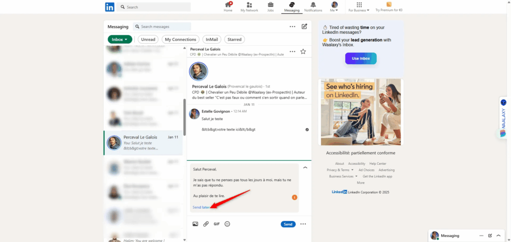 To schedule a message on LinkedIn, you can do so directly from Waalaxy. Click on “Send later”: