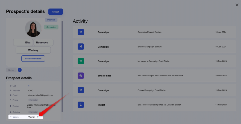 Abbiamo integrato un’intelligenza artificiale in grado di indovinare il sesso dei vostri clienti potenziali: questi dati vengono aggiunti automaticamente al loro profilo e potete quindi filtrare in base al sesso per lanciare campagne di genere (ad esempio, utilizzare i signori nei vostri messaggi automatici su LinkedIn).