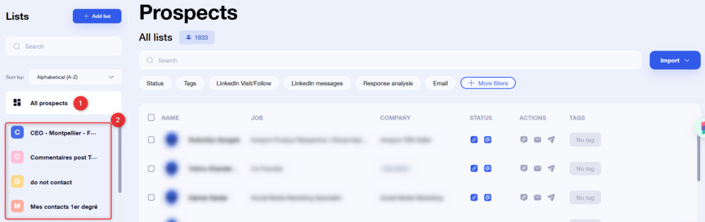 O Meet Alfred é uma aplicação Web. Não é necessário descarregar uma extensão do navegador para a utilizar. No entanto, isto tem uma desvantagem: tudo tem de passar por esta aplicação. As importações, por exemplo, não podem ser feitas diretamente a partir de uma janela do LinkedIn ou do Sales Navigator, o que para nós é uma desvantagem: ao importar diretamente através da aplicação, não visualiza os potenciais clientes na sua pesquisa antes de os importar, e estão disponíveis muito menos filtros 😰.