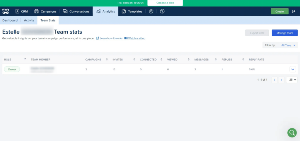 Estas estatísticas são menos completas do que as disponíveis no Waalaxy. Além disso, não existem elementos gráficos e não é possível visualizar todas as estatísticas campanha a campanha (por exemplo, número de convites enviados), o que não deixa de ser interessante para a prospeção.
