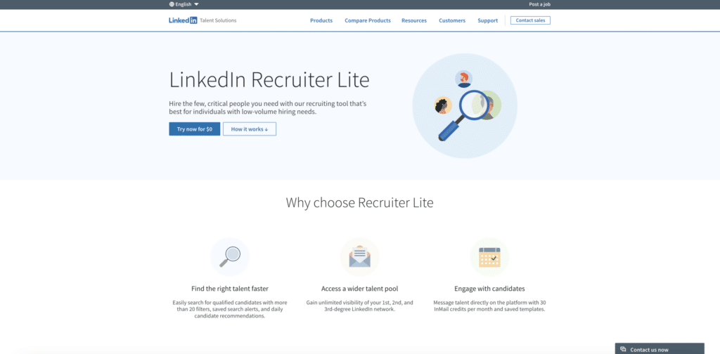 O LinkedIn ajuda os utilizadores a encontrar, avaliar e contactar candidatos qualificados, fornece acesso a uma extensa base de dados de prospeção de páginas de perfis do LinkedIn, com opções de pesquisa avançadas para refinar critérios (competências, experiência, localização, etc.).